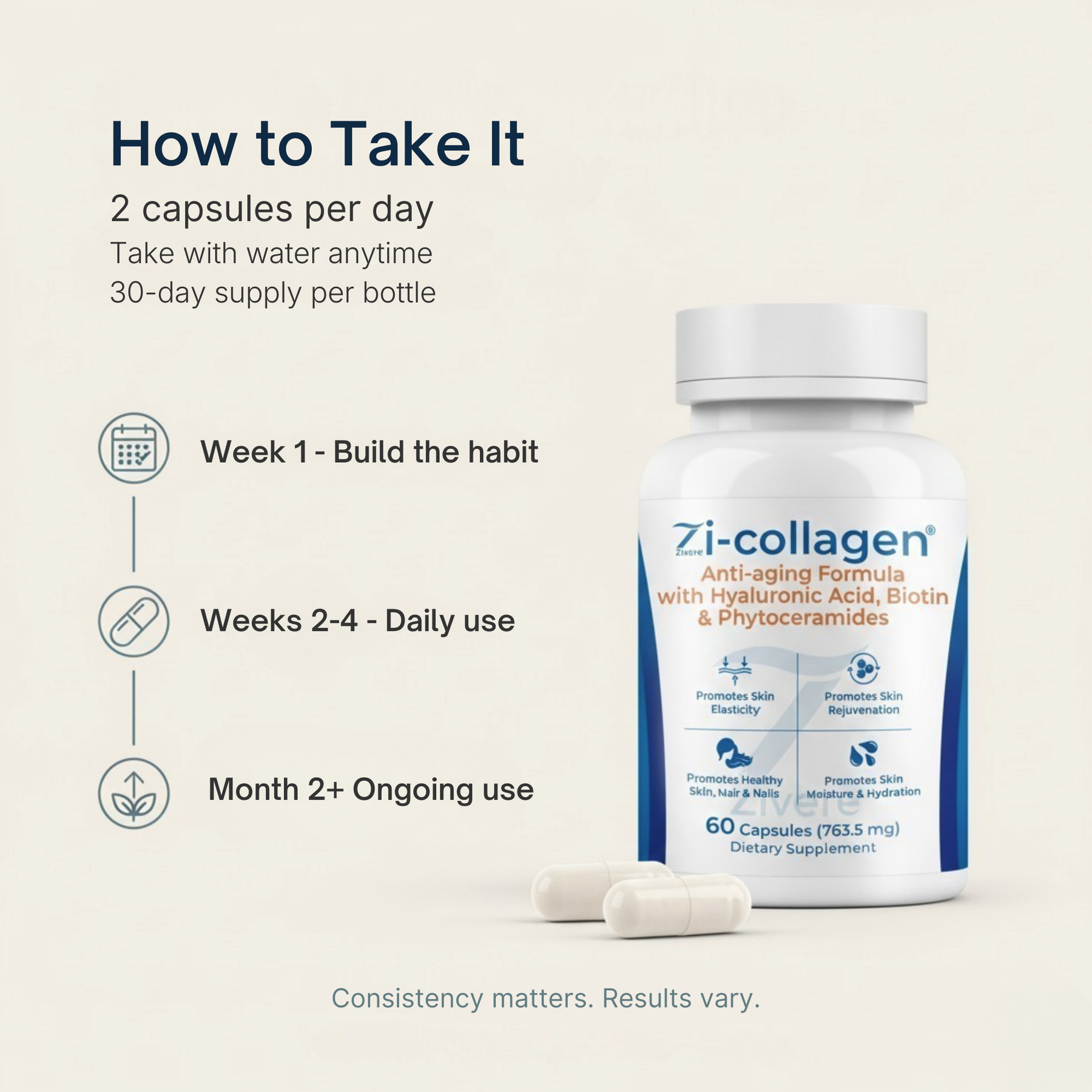 Zi-Collagen is taken as capsules. Take 2 daily with water.