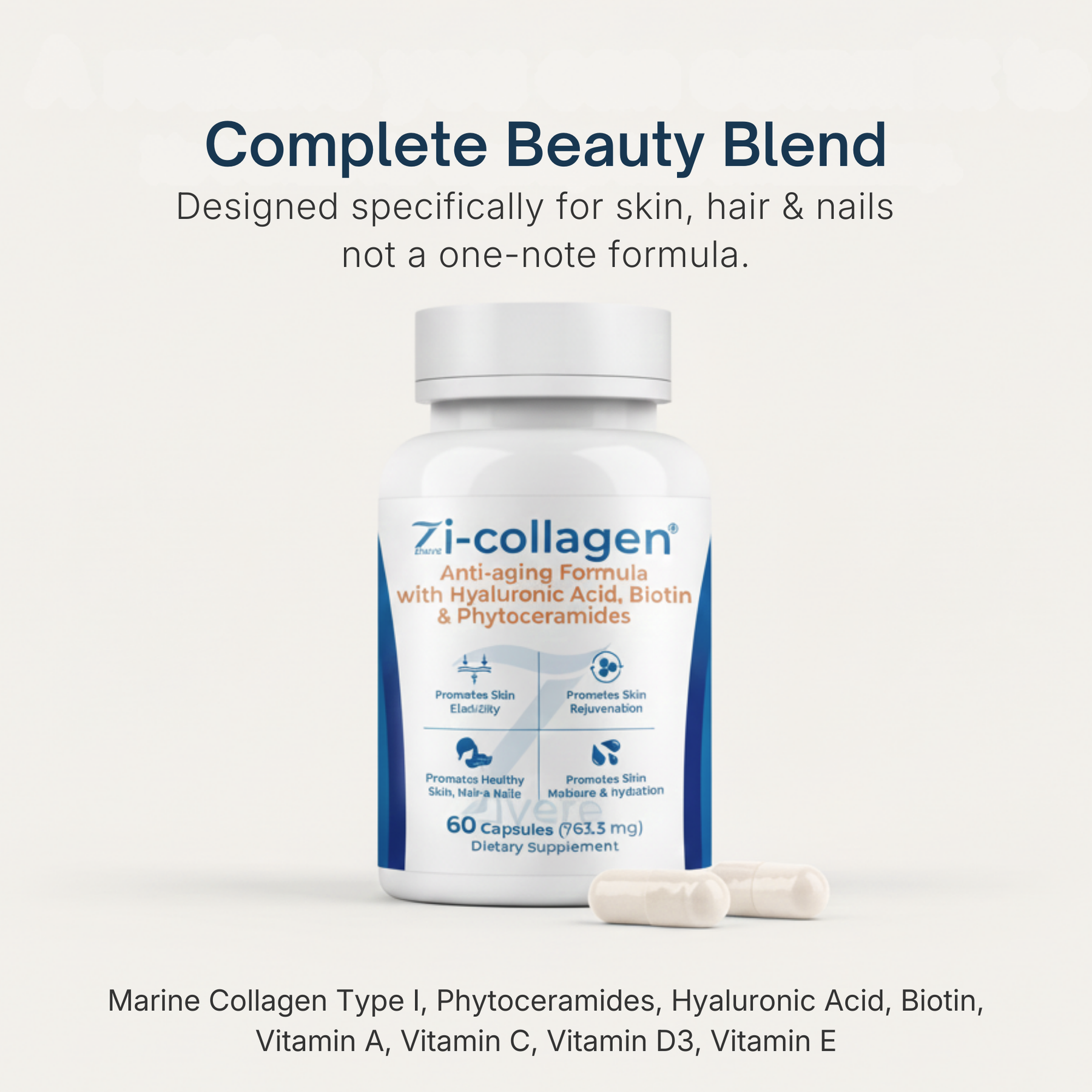 Zi-Collagen is a multi-ingredient skin, hair & nails formula, collagen plus targeted cofactors (phytoceramides, hyaluronic acid, biotin, and vitamins) in one clearly labeled supplement.
